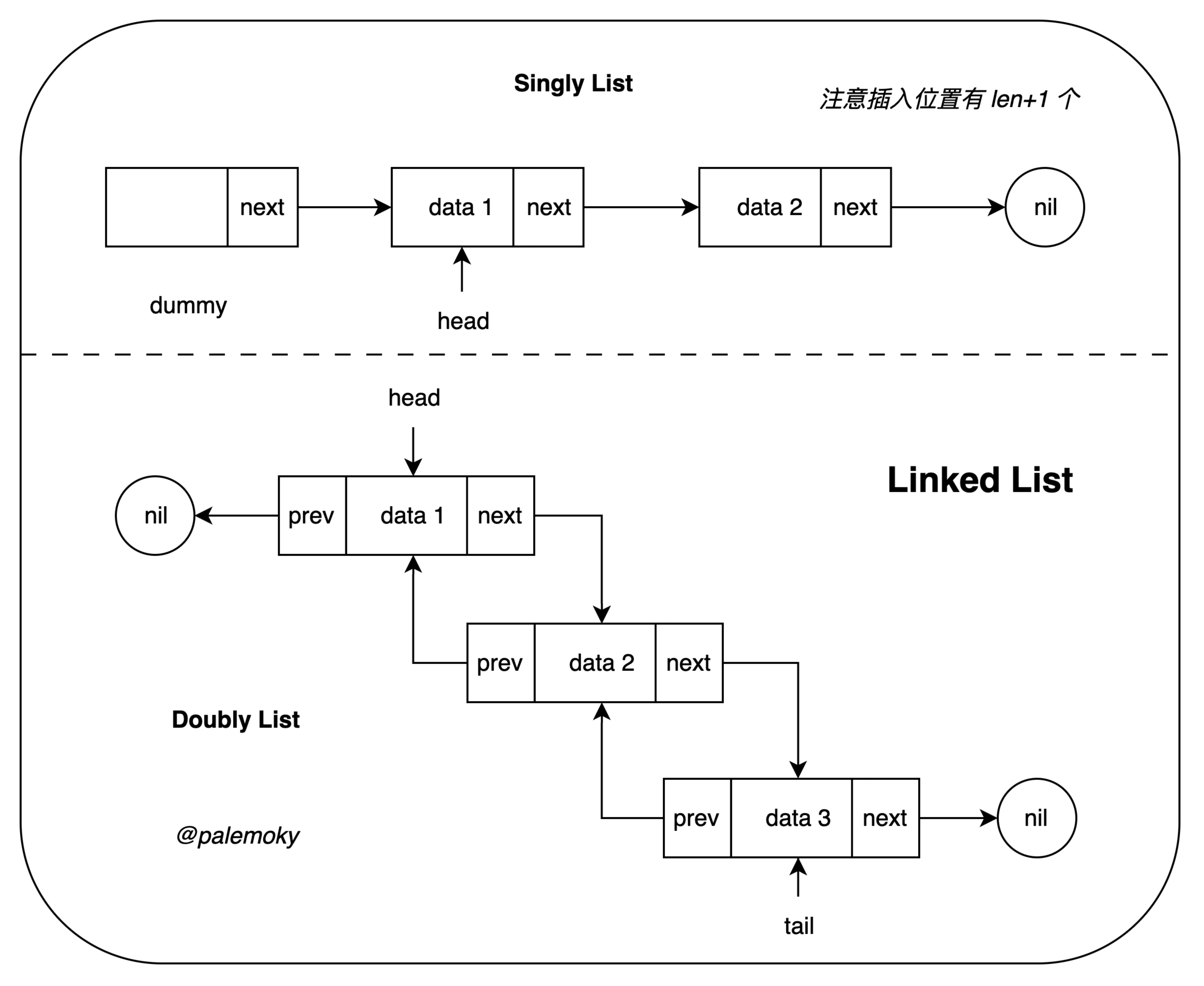 len的链表,有len + 1个可供插入的位置(从头部之前到尾部之后)。 - 当题目描述“在索引